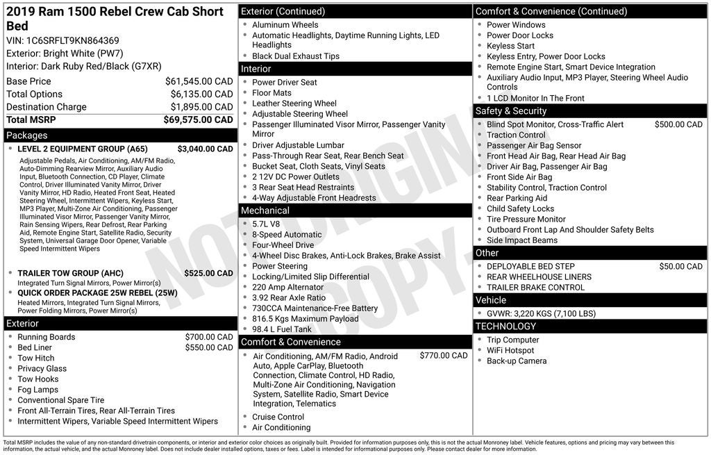 Find your wild side with our HEMI Powered 2019 RAM 1500 Rebel Crew Cab 4X4 with the Level 2 Equipment Package in Bright White! Motivated by a 5.7 Liter HEMI V8 that offers 395hp matched to an 8 Speed Automatic transmission for astonishing passing authority. You will be in total control with this unstoppable Four Wheel Drive truck with eLocker differential and Bilstein Monotube Shocks for incredible off-road capability, scoring nearly 20mpg on the highway. Add some extra swagger to your day with our 1500, which commands the road with 33-inch tires, unique wheels, a large black grille, and dual exhaust.